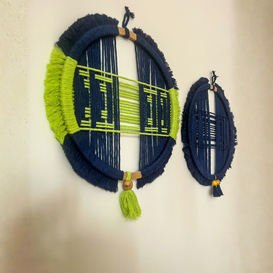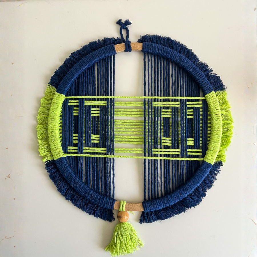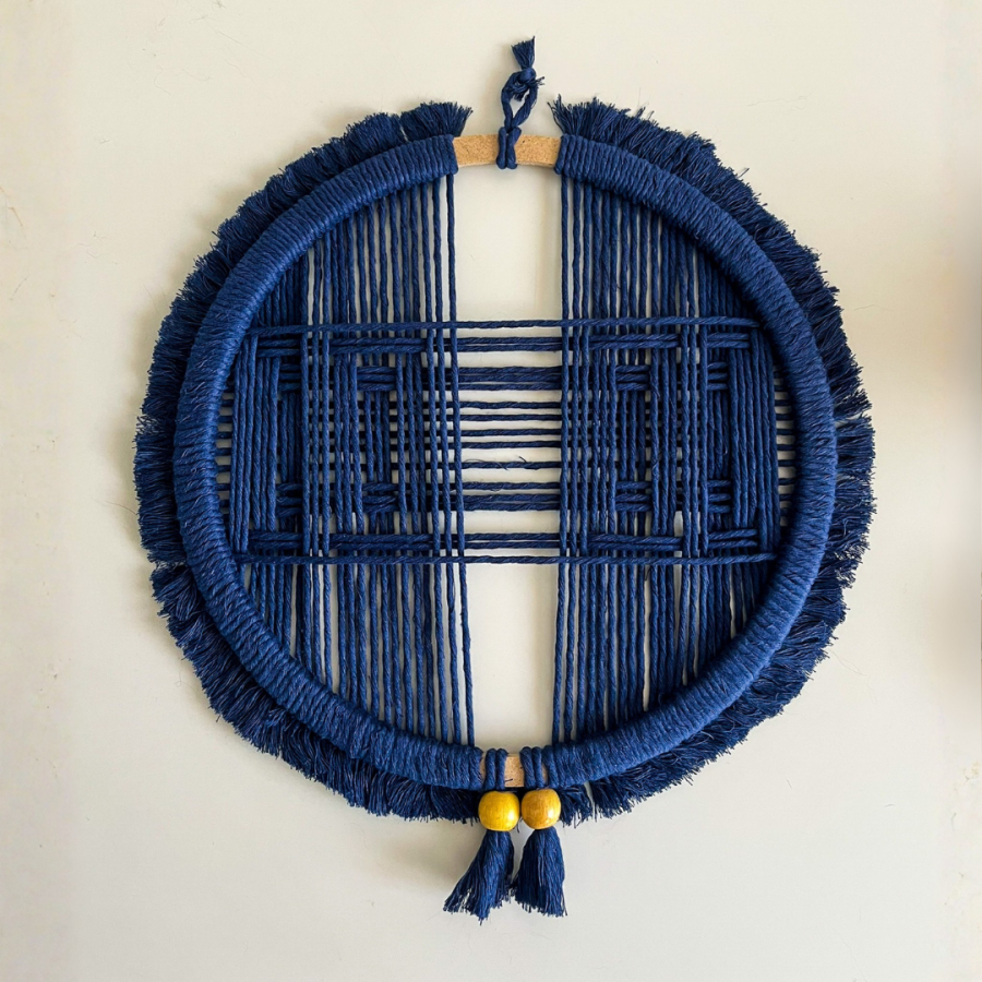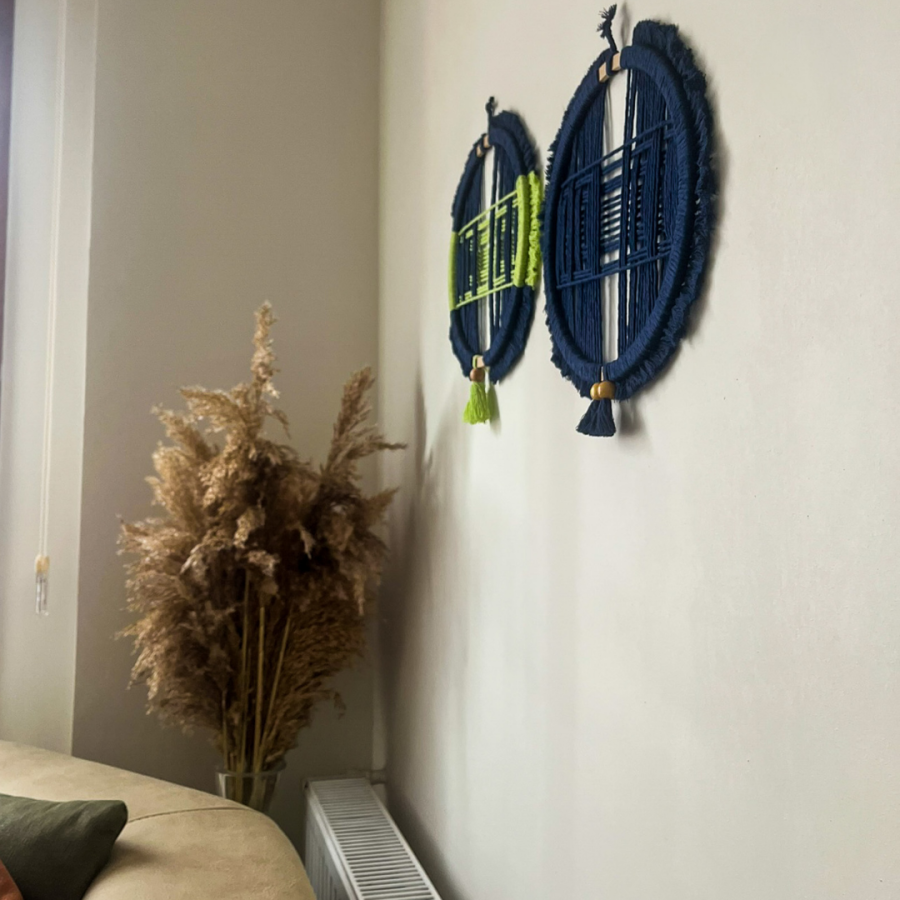 Katmanlı ip geçişleriyle 3 boyutlu bir görünüm sunan bu özgün makrome duvar süsü, modern dekorasyon sevenler için ideal bir seçimdir.