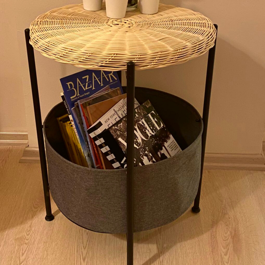 Bambu çantalı sehpanın üst kısmı %100 doğal rattan çubukları ile örülmüştür. Alt bölmesinde eşyalarınızı muhafaza edeceğiniz, gazete ve dergilerinizi koyabileceğiniz ya da battaniyenizi koyabileceğiniz bir çanta mevcuttur.