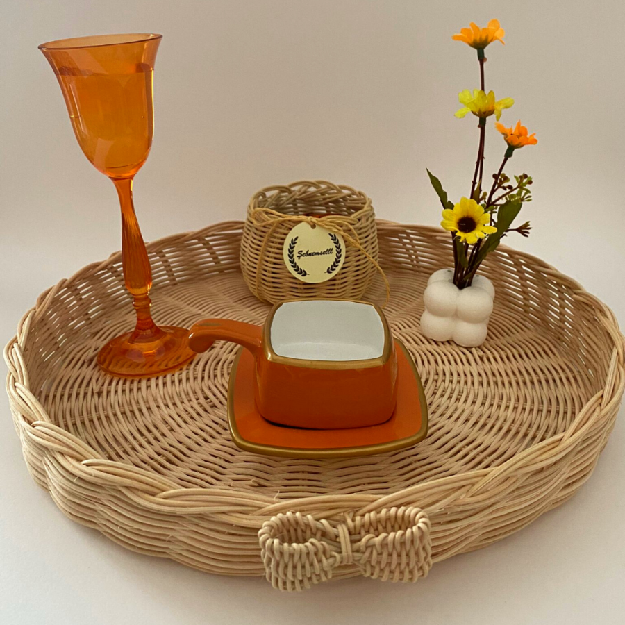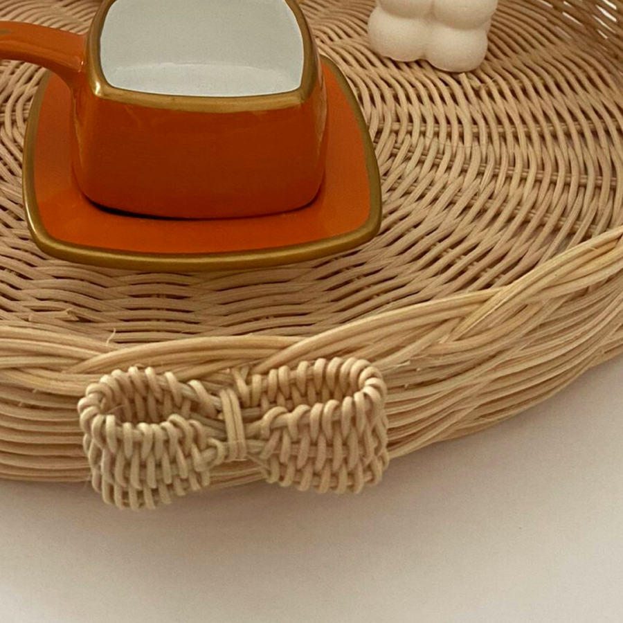 Fiyonk detaylı bambu sunum tepsisi, yüzde yüz doğal rattan çubukları ile örülmüştür.