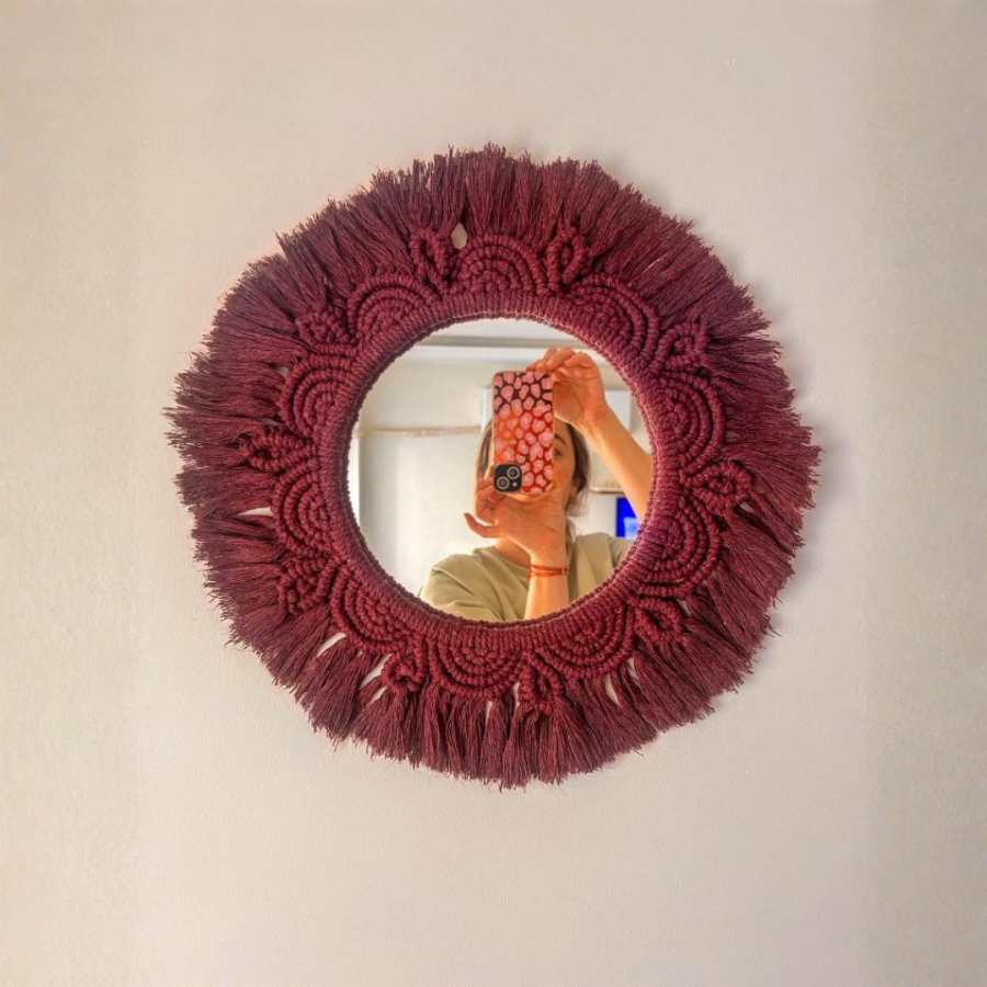 Bohem tarzıyla öne çıkan bu el yapımı mor makrome duvar aynası, yaşam alanlarınıza modern ve estetik bir dokunuş katar.
