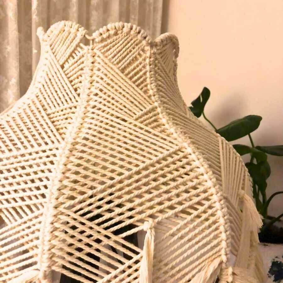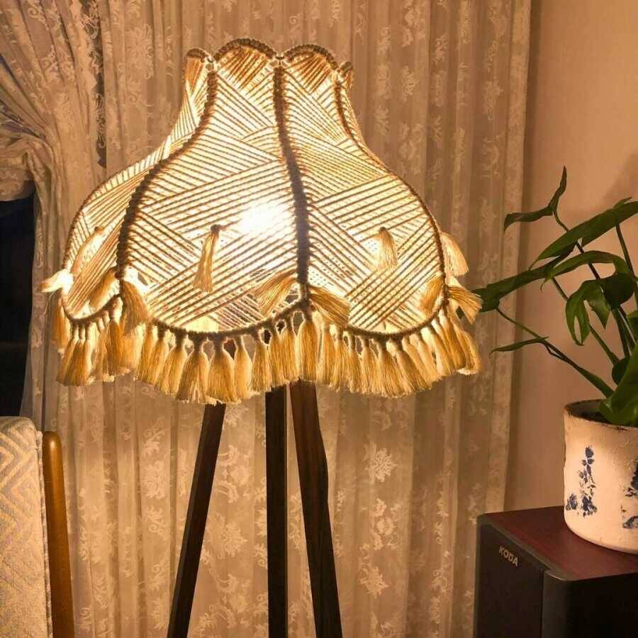 Çiçek Lambader doğal makrome iplerinden üretilmiştir.Ürünün çapı 45 cm.yüksekliği 38 cm dir.Ürün sadece başlık olarak satıştadır.Ayak görsel amaçlı kullanılmıştır.