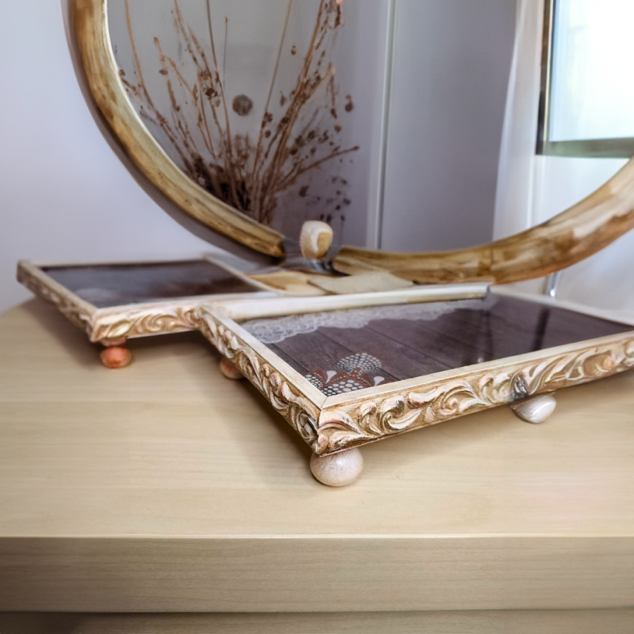 Dantel desenli sunumluk/tepsi, evinize zarafet ve şıklık katmanın mükemmel bir yoludur. Zarif dantel detaylarıyla süslenmiş bu sunumluk/tepsi, özel davetlerden günlük kullanıma kadar her masaya zarafet katar. Misafirlerinizi etkilemek ve sofranızı özel kılmak için ideal bir seçim.Pratik ve Fonksiyonel: Dantel Desenli Sunumluk ile Sunumları Kolaylaştırın