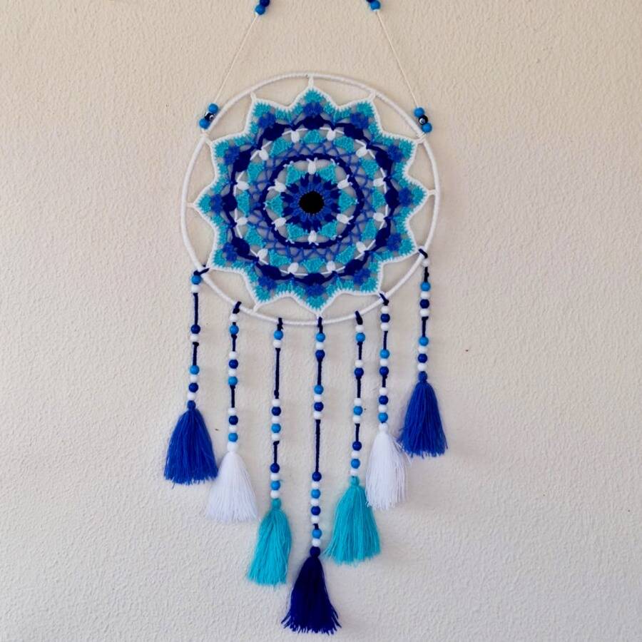 Metal çember üzerine titizlikle işlenmiş, 85 cm uzunluğunda el emeği tığ işi duvar süsü. Kaliteli sentetik orlon ve şık boncuk detaylarıyla hazırlanan bu özel parça, evinize hem evinize otantik bir dokunuş, hem de huzurlu bir hava katacak.