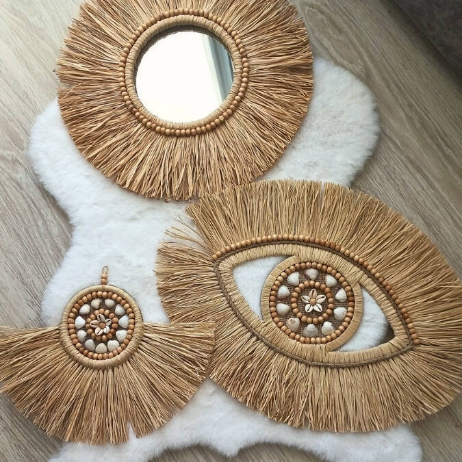 Büyüleyici Göz Formlu Rafya Ayna: Odak noktanız olacak bu sanatsal parça, derinlik katan göz formu ve doğal deniz kabukları ile ahşap boncukların harmonik dansıyla tüm dikkatleri üzerine çeker. Mekanınıza mistik ve koruyucu bir enerji yansıtır.
