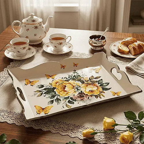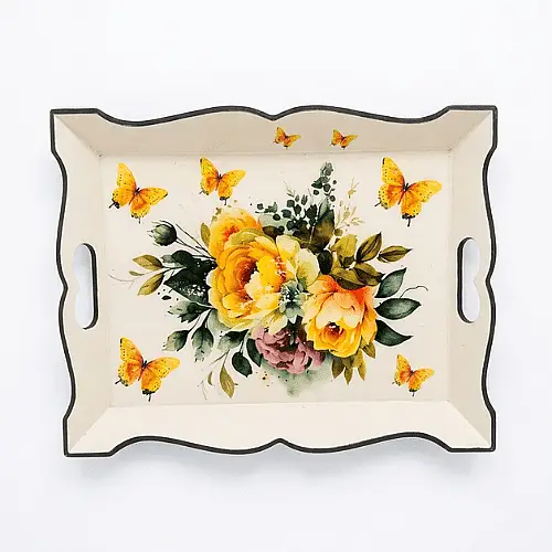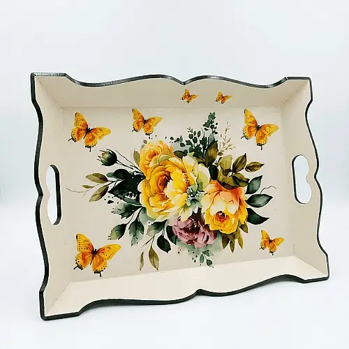 El Boyaması Çiçek Desenli Dekoratif Ahşap Tepsi