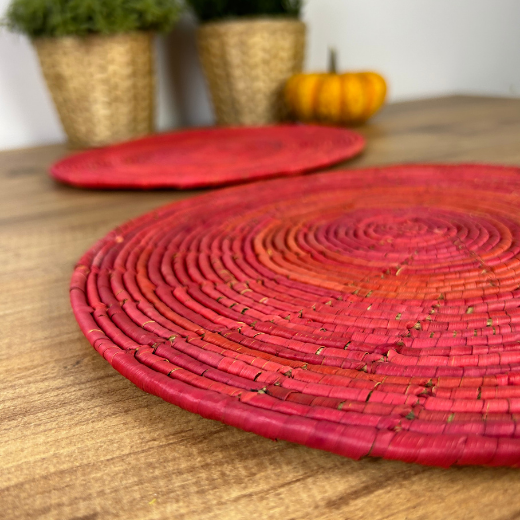 El Yapımı Kırmızı 2’li Hasır Supla Seti 30cm Çap – Amerikan Servis, Dayanıklı Örgü, Modern Rustik Masa Dekoru