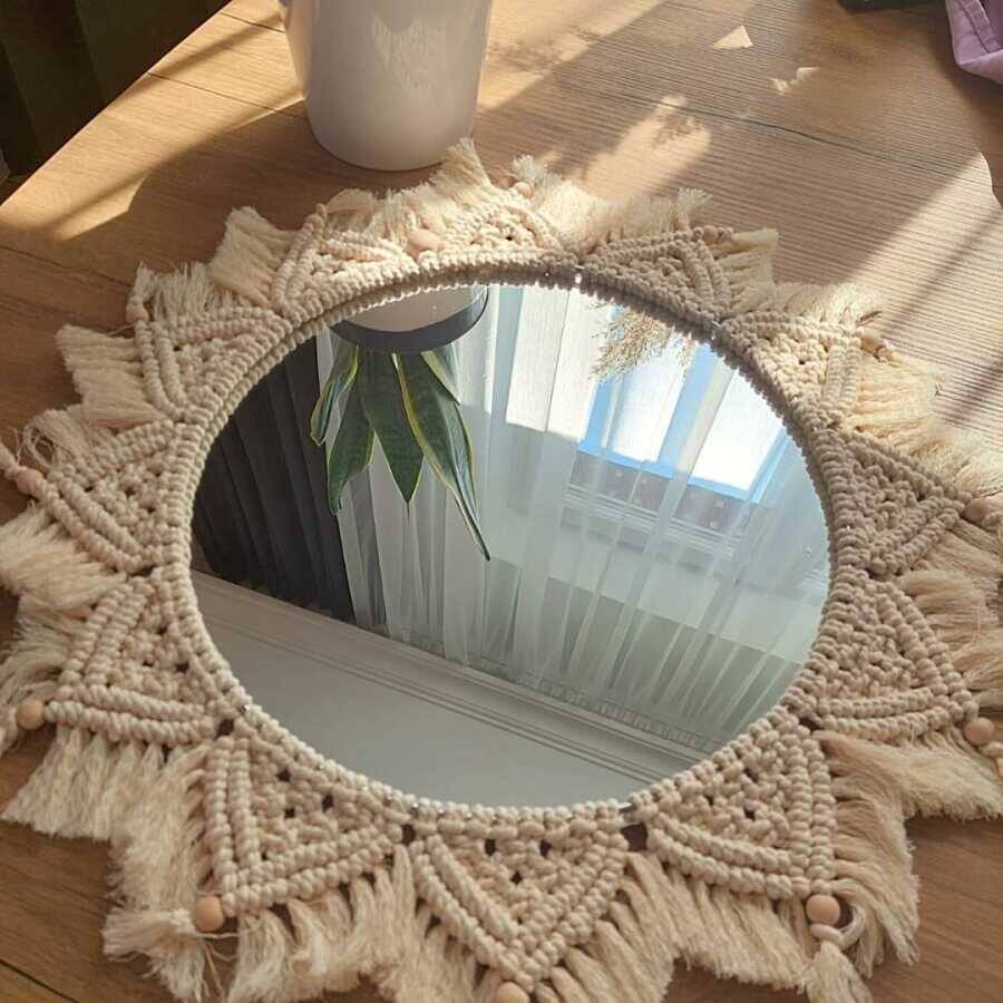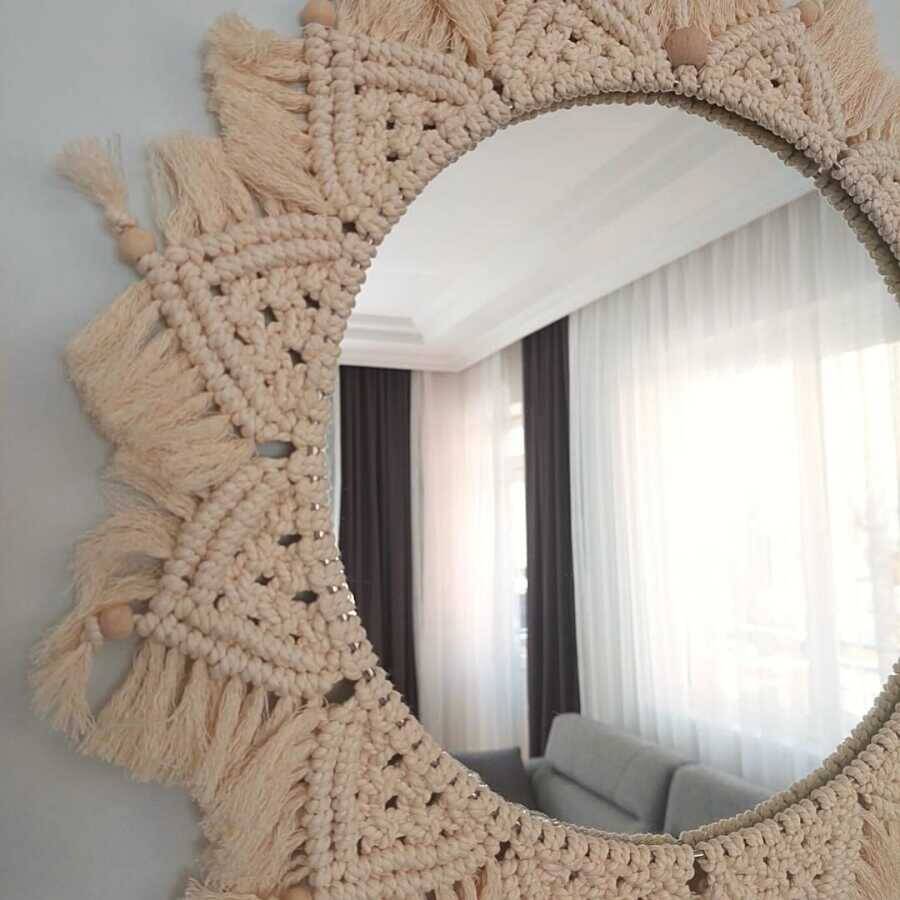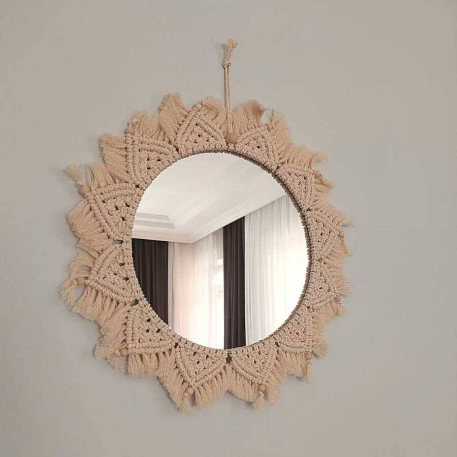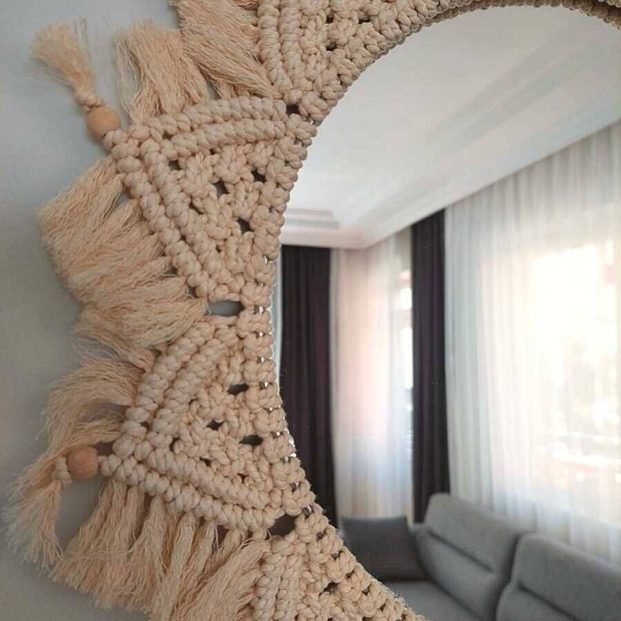 - Makrome örgü, aynayı zarif bir şekilde çerçeveleyerek estetik bir görünüm sunar.