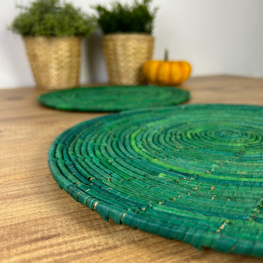 El Yapımı Yeşil 2’li Hasır Supla Seti 30cm Çap – Amerikan Servis, Dayanıklı Örgü, Modern Rustik Masa Dekoru