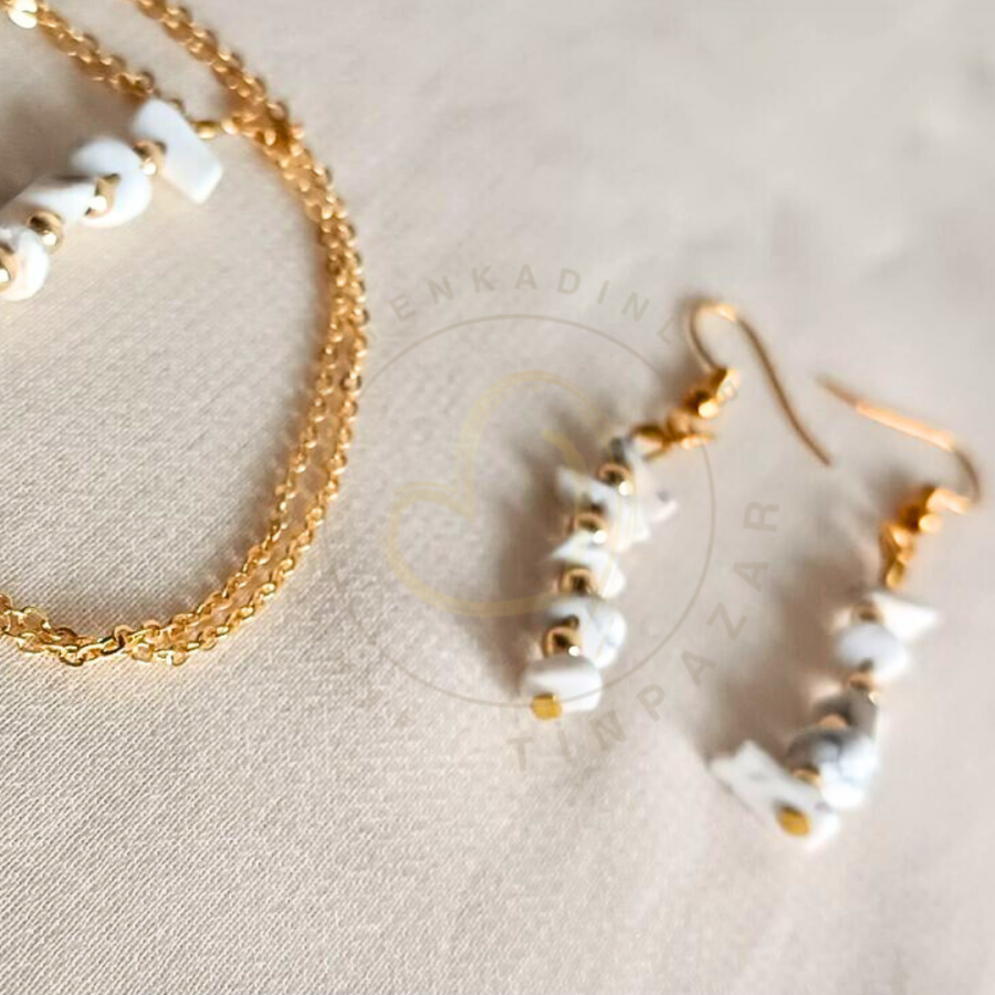 Bu takı seti, zarafetini ve şıklığını vurgulamak için mükemmel bir seçenektir. Havlit taşının büyüleyici tonları, her kıyafetle mükemmel uyum sağlar. Setin her parçası, zarif detaylarla süslenmiş, göz alıcı bir etki yaratır. Bu takı seti, her anınızda sana eşlik edecek, tarzına ve kişiliğine benzersiz bir dokunuş katacak.
