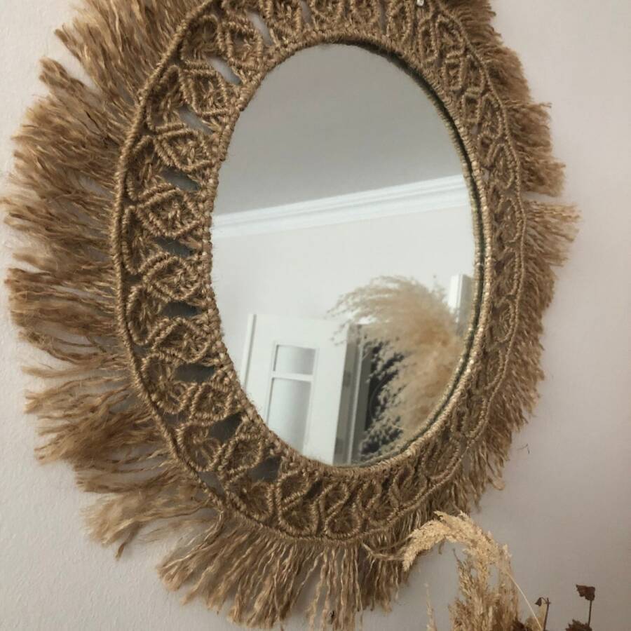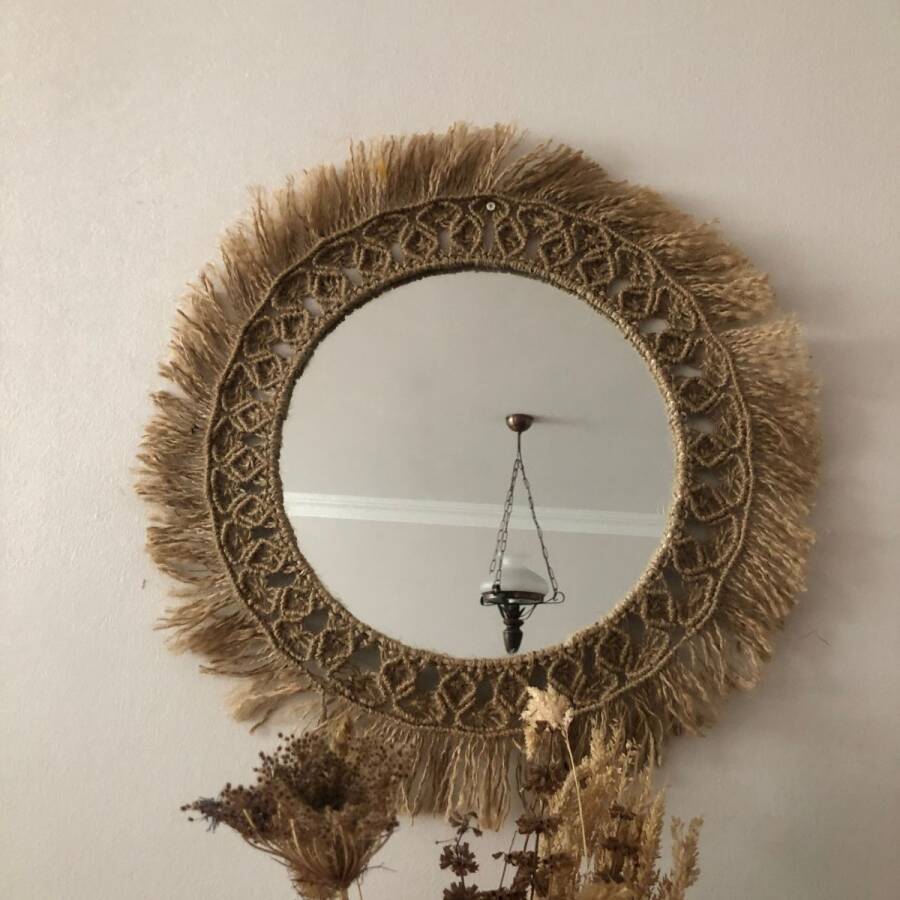 Doğal jüt ipinden yapılmıştır.Aynanın çapı 27 cm.,ürünün çapı 35 cm dir.İstenilen ölçülerde çalışılabilir.