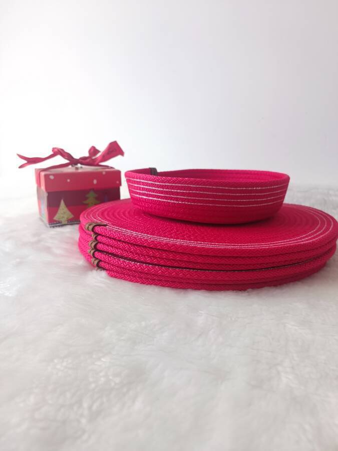 Kırmızı polyester ipin enerjisi, gümüş metalik simin ışıltısıyla bir araya gelerek sofralarınıza büyülü bir dokunuş katıyor. Makinada el emeğiyle özenle dikilmiş bu özel set, hem günlük kullanımda hem de özel günlerinizde masalarınıza şıklık katacak.