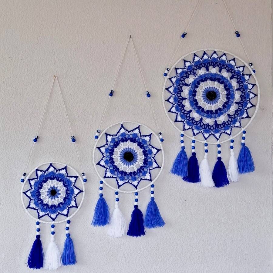 Metal çember üzerine işlenen tığ işi mandala dokusuyla hazırlanan bu 3’lü set, evinize otantik bir hava ve doğanın huzurunu taşır. Mavi tonları duvara ferahlık verirken, püsküllü detaylar ortama yumuşak ve şık bir hareket katar.