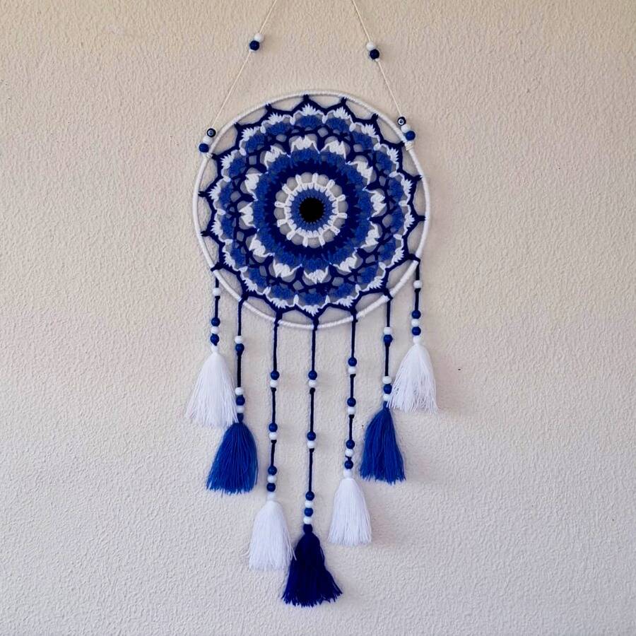 Metal çember üzerine titizlikle işlenen, 85 cm uzunluğunda el emeği tığ işi mandala duvar süsü. Kaliteli sentetik orlon ip ve şık boncuk detaylarıyla tamamlanan bu özel parça, evinize hem otantik bir dokunuş hem de huzurlu bir hava katmak için tasarlandı.