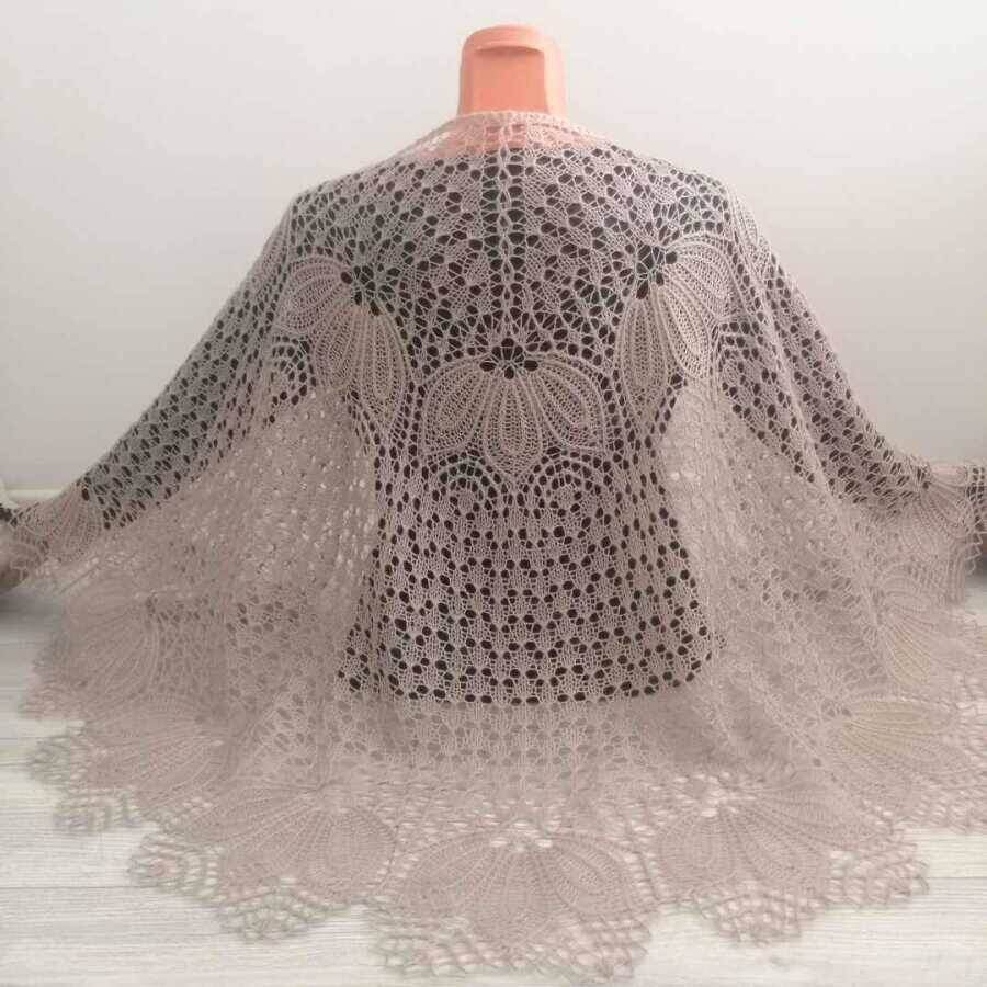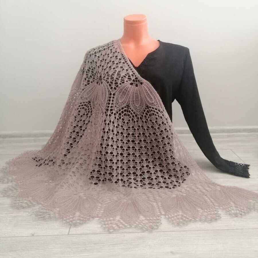 Yaklaşık 175-180 cm eni ve 75-80 cm boyuyla her bedene uyum sağlayacak şekilde tasarlanan bu şal, istenilen ölçülerde de örülebilir.