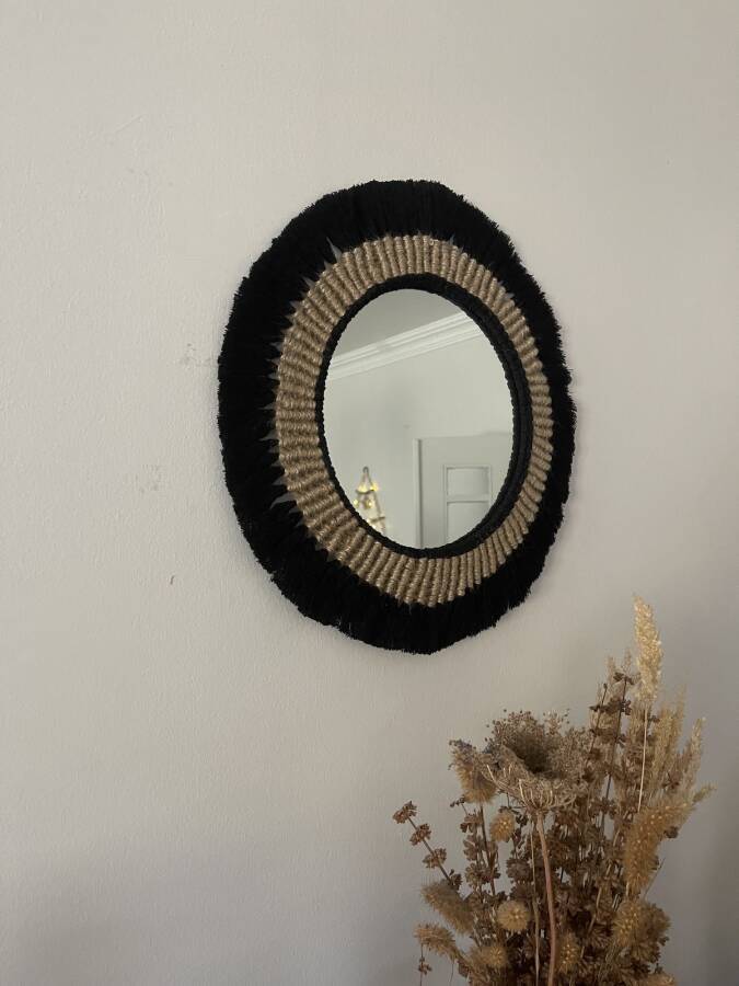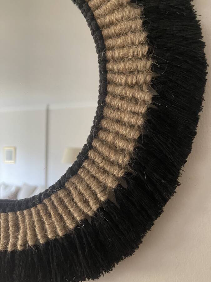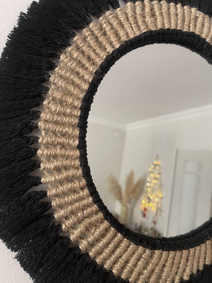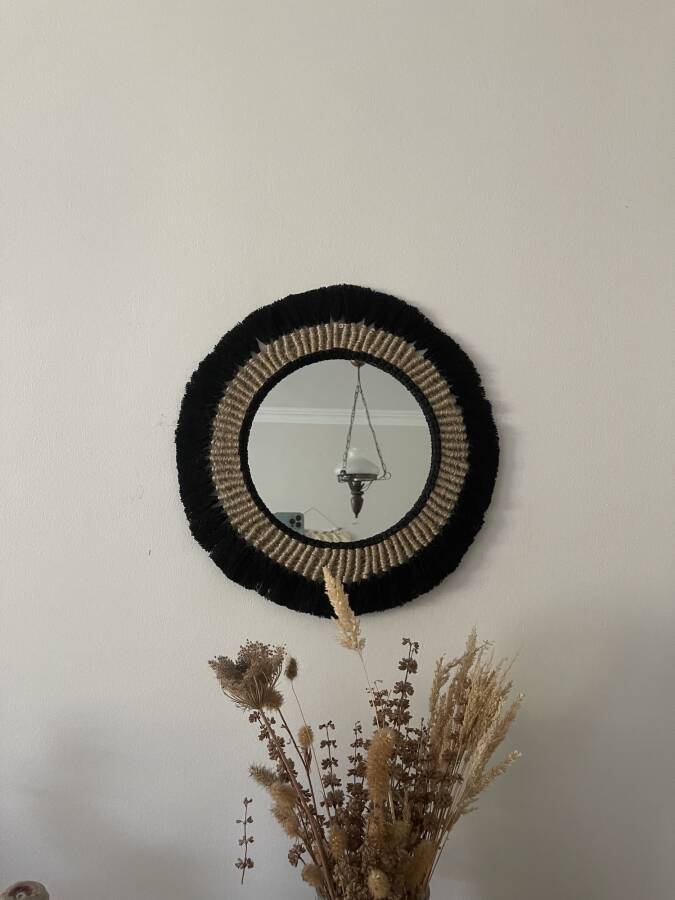 Aynamız doğal pamuk makrome ipi ve jüt ip kullanılarak üretilmiştir.Evinizde farklı bir şıklık yaratacak..Aynanın çapı 27 cm.ürünün çapı 35 cm dir.