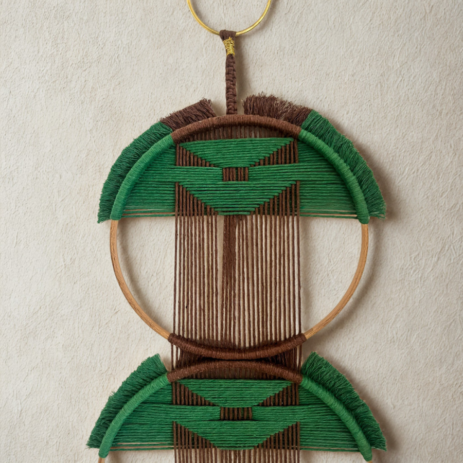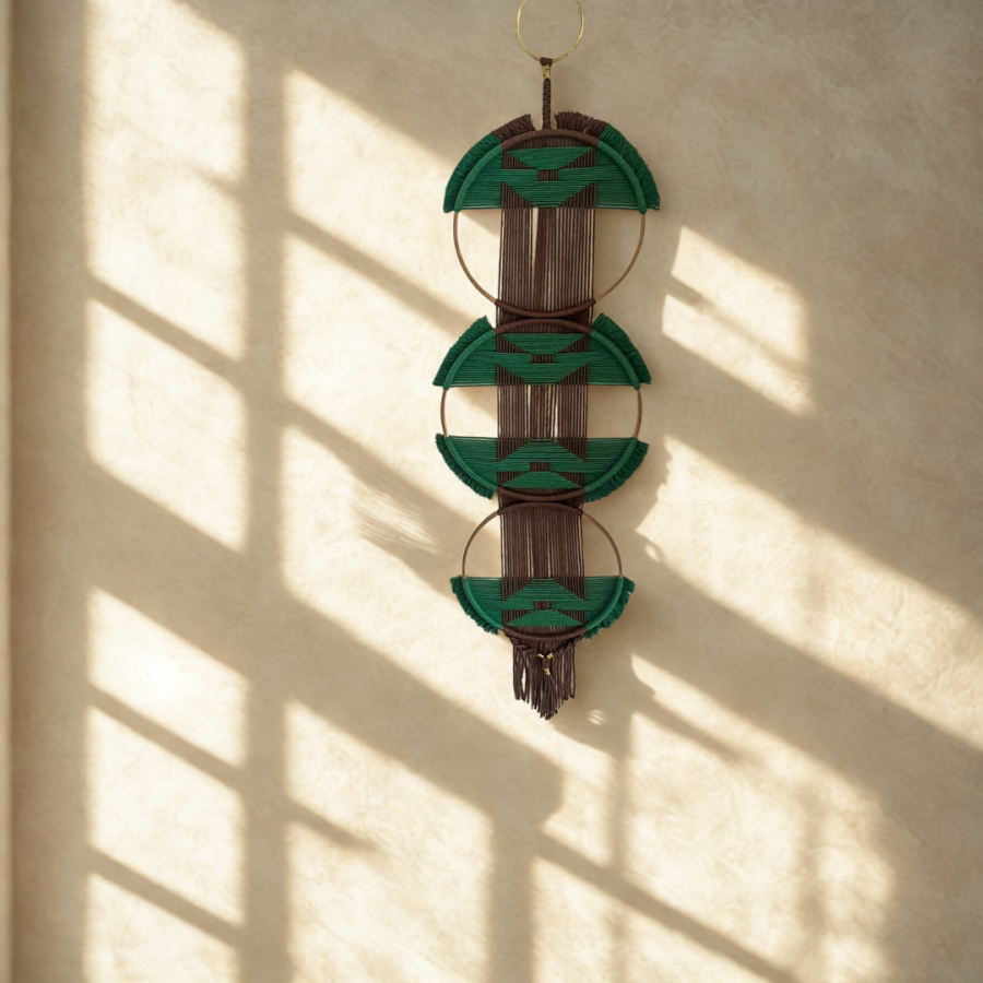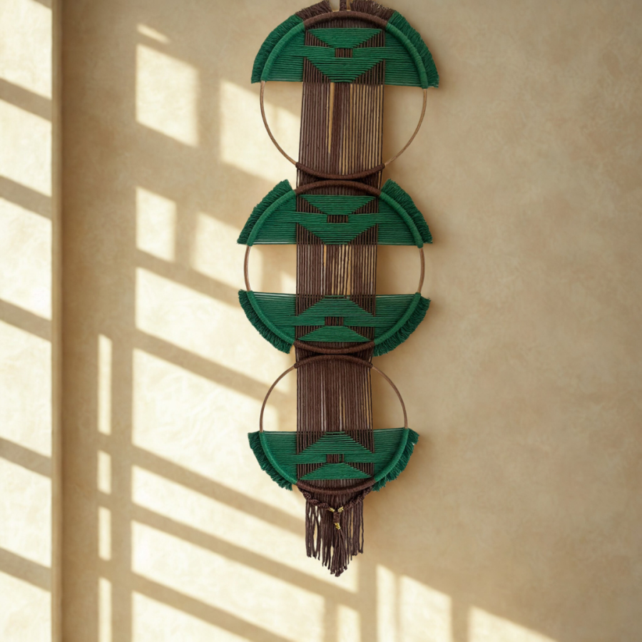 Doğanın en huzurlu tonlarını taşıyan Terra Verde, üç adet geometrik kasnaktan oluşan özgün bir duvar dekorudur. Yeşil ve toprak tonlarının uyumu, el emeği makrome detaylarla birleşerek yaşam alanlarınıza sakin ve stil sahibi bir atmosfer kazandırır.