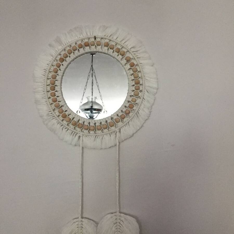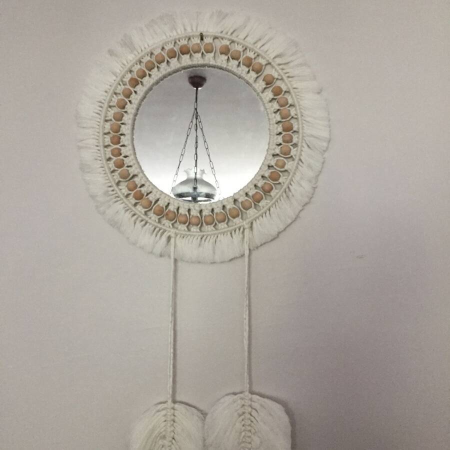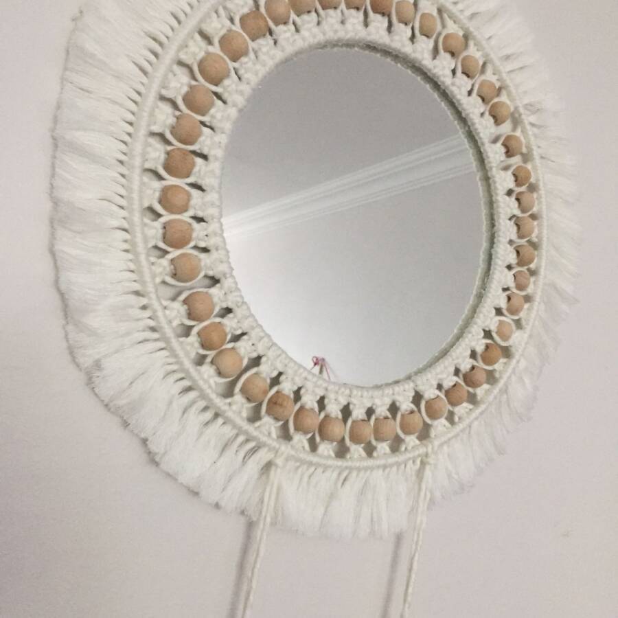 Doğal pamuk makrome ipinden üretilmiştir.Aynanın çapı 30 cm ürünün çapı 40 cm dir.İstenilen renk ve ölçülerde yapılabilir.