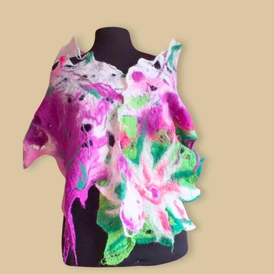 Doğanın zarafetini ve el emeğinin inceliklerini buluşturan Zambak Şal, geleneksel el ustalığıyla işlenmiş ıslak keçe kaynaştırma teknolojisiyle hayat buluyor. Her detayında özenle işlenen bu şal, estetik görünümlü büyüleyici bir ürün olarak öne çıkıyor.